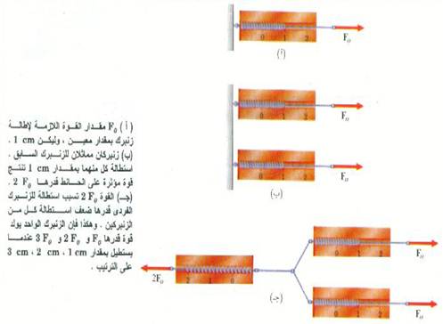 ولمضاعفة هذه القوة المعيارية مرتين أو ثلاث علينا فقط ربط الجسم في زنبركين متماثلين أو ثلاثة وشدها حتى تصل إلى نفس الاستطالة العيارية ، وهذا مبين بالشكل 1) ب) فإن المؤشر سيبين مقداراً معيناً من استطالة الزنبرك ، وبالتالي مقداراً معيناً من القوة التي يؤثر به الزنبرك على الجسم. معنى ذلك ان هذا القدر من الاستطالة يناظر دائماً نفس القدر من القوة. ومن ثم يمكن استخدام هذا المقدار الاعتباطي من الاستطالة كدلالة لكمية عيارية من القوة التي يؤثر بها الزنبرك.
