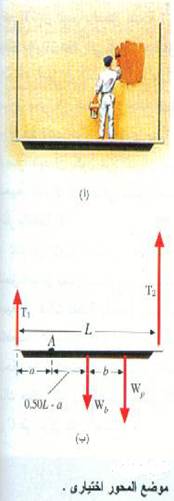 لنأخذ الموقف المبين بالشكل (1) الذي يمثل رسام إعلانات وزنه Wp وافقاً في حالة اتزان على لوح خشبي منتظم وزنه Wb وطوله L. مركز ثقل هذا اللوح يقع في مركز الهندسي ، ولهذا فإن Wb يؤثر عند هذه النقطة كما هو واضح في الشكل 1) ب). لنفرض أن الشدين في السلكين الحاملين T1 و T2 سوف نثبت الآن أن الصورة الأخيرة لمعادلة عزوم الدوران لحالة الاتزان هذه لا تعتمد على المحور المختار.
