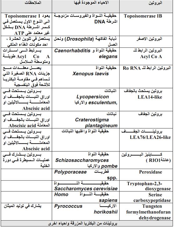 جدول 1 : بعض البروتينات والجينات الموجود في D. radiodurans المكتسبة من الاحياء الاخرى