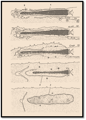 الشكل (1): تمثيل للمراحل المتتالية لعملية اختراق النطفة للبيضة ، كما لوحظت عند احد انواع القوارض