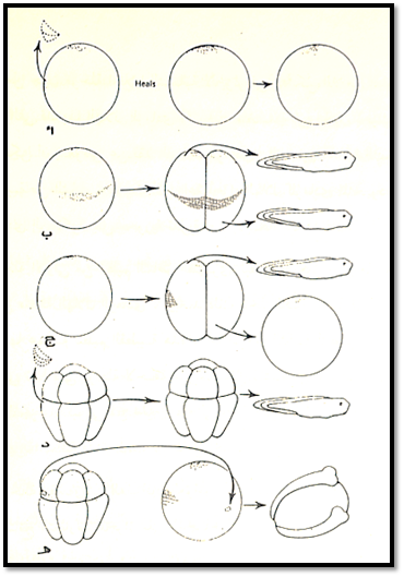 إن التجارب المذكورة آنفا تسمح لنا بالاستنتاج أن الهلال الرمادي يلعب دورا هاما في الشكل الجنيني خلال المراحل المبكرة , ولقد بينت التجارب التي أجريت على الجنين في مرحلة الخلايا الثمانية أنه بينما لا يزال الهلال الرمادي المأخوذ من جنين هذه المرحلة قادرا على أن يعطي جنينا في حالة زرعه في الجانب البطني للبيضة فإن استئصاله من جنين مرحلة الخلايا الثمانية لا يؤثر في التشكل اللاحق , بالتالي فإن المعلومات التي قدمها الهلال الرمادي اصبحت متضمنة في الجنين بحيث أن النشاط التنظيمي يمكن أن يعوض عن فقد الهلال الرمادي . إن جنين الخلايا الثمانية يتمتع بدرجة كافية من الثبات , بحيث أن زراعة أجزاء الهلال الرمادي المأخوذة من البيضة عليه لا تردي الى تكون بني محورية ثانوية .