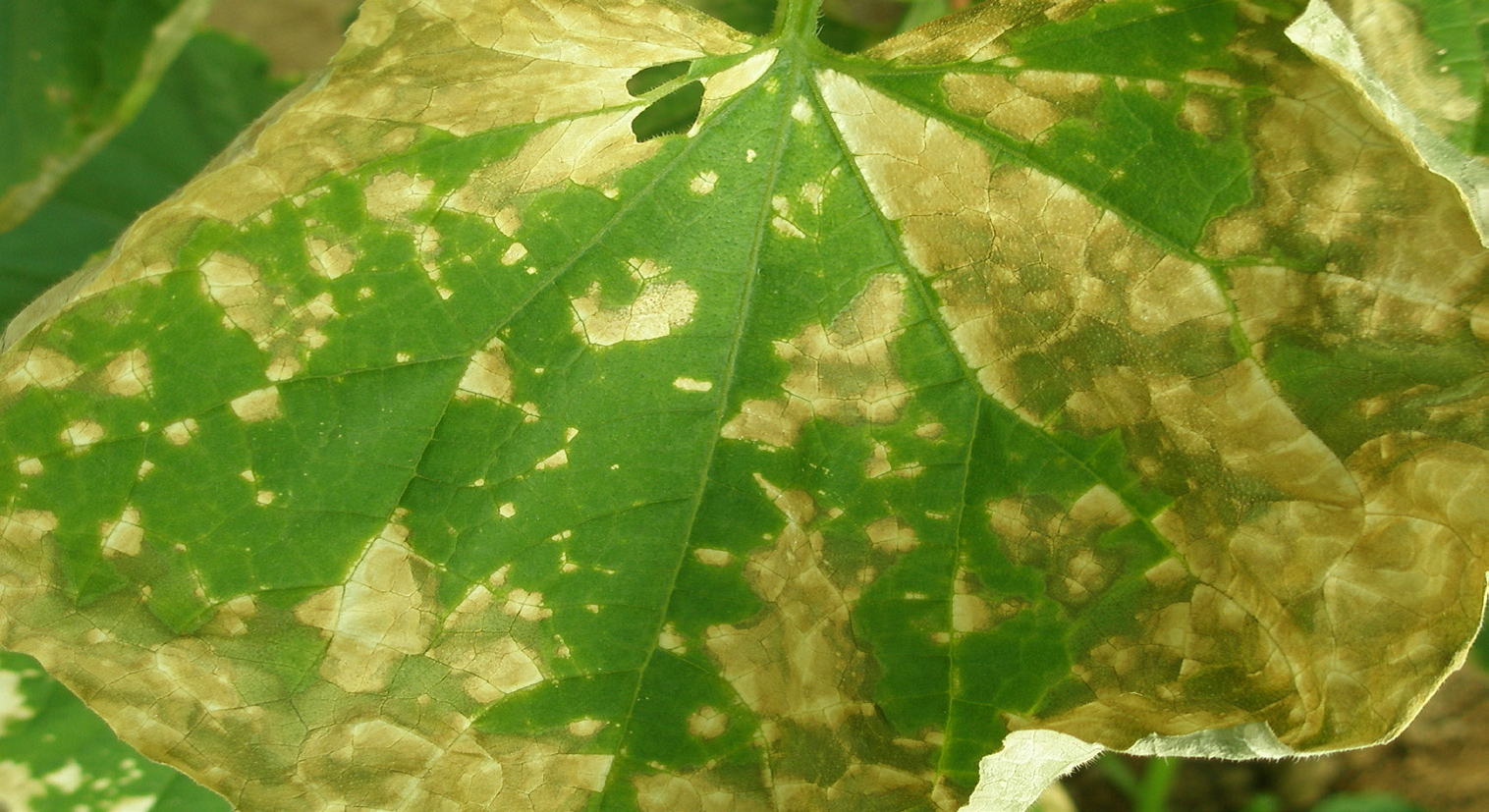 شكل يوضح أوراق نبات خيار محترقة من أثر المبيدات