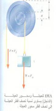 سنقوم الآن بتوضيح فائدة هذه المعادلات بالرجوع إلى الآلة البسيطة الموضحة بالشكل (2). هذه الآلة تسمى العجلة ومحور العجلة وهي تستخدم لرفع حمل ثقيل W باستعمال دخل قوة صغير. ويمكن حساب IMA للآلة بملاحظة أنه عندما تدور العجلة ومحور العجلة دورة كاملة سوف يلتف من أحد الحبلين وينفك من الآخر طول يساوي محيط الدائرة المناظرة ، ومن ثم فإن s1= 2πb،s0 = 2πa إذن: