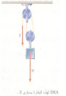 تعتبر البكرات أيضاً آلات بسيطة هامة .والبكارة الموضحة بالشكل (4) نستطيع رفع جسم وزنه M عندما يشد الحبل المار على البكرة العلوية بقوة F. هذه البكرة مثبتة في السقف سوف تتحرك مسافة قدرها 0.5s1 عندما يشد الحبل مسافة قدرها s1 على البكرة العليا. (يقصر كل من الحبلين اللذين يحملان البكرة السفلى بمقدار 0.5s1 ، وبذلك يكون النقص الكلي في طول الحبل بين البكرتين s1، ومن ثم: