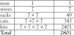 The charm of the poem lies in its ambiguity and the various questions it can generate. We could ask: how many were coming from St Ives? Again interpretation is important. Can we be sure the man with his seven wives were all travelling away from St Ives? Were the wives accompanying the man when he was met, or were they somewhere else? The first requirement of a combinatorial problem is that assumptions be agreed beforehand.