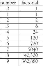 A number obtained by multiplying successive whole numbers is called a factorial number. These occur so often in mathematics that they are written using the notation 5! (read ‘5 factorial’) instead of 5 × 4 × 3 × 2 × 1. Let’s take a look at the first few factorials (we’ll define 0! to equal 1). Straightaway, we see that quite ‘small’ configurations give rise to ‘large’ factorial numbers. The number n may be small but n! can be huge.