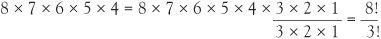 are made from the same letters but are different queues. We already know there are 5! queues that can be made with these letters. If we’re interested in counting the ways of selecting 5 people from 8 immaterial of order we must divide 8 × 7 × 6 × 5 × 4 = 6720 by 5!. The number of ways of selecting 5 people from 8 is therefore