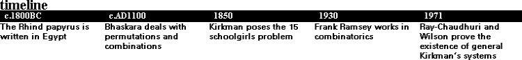 The essence of combinatorics is captured by a master of the subject, Rev. Thomas Kirkman, working at a time when combinatorics was mostly linked to recreational mathematics. He made many original contributions to discrete geometry, group theory and combinatorics but never had a university appointment. The conundrum which reinforced his reputation as a nononsense mathematician was the one for which he will always be known. In 1850 Kirkman introduced the ‘15 schoolgirls problem’, in which schoolgirls walk to church in 5 rows of 3 on each day of the week. If you are bored with Sudoku you might try to solve it. We need to organize a daily schedule so that no two walk together more than once. Using lower case and upper case deliberately, the girls are: abigail, beatrice, constance, dorothy, emma, frances, grace, Agnes, Bernice, Charlotte, Danielle, Edith, Florence, Gwendolyn and Victoria, labelled a, b, c, d, e, f, g, A, B, C, D, E, F, G and V, respectively.