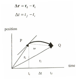 الشكل رقم (1-1) يمثل متجه موقع الجسم (r) كدالة الزمن نسبتا إلى نقطة الأصل. عندما يتحرك الجسم من نقطة P إلى نقطة Q فإنه يقطع متجه إزاحة ∆r خلال فترة زمنية t∆ حيث: