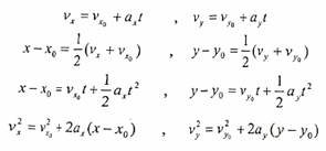وفي حالة كون التسارع منتظم، إذا بالإمكان تطبيق قوانين الحركة الخطية على حركة الجسم على محورين وذلك بفصل الحركة إلى حركتين إحداهما باتجاه المحور السيني والأخرى باتجاه المحور الصادي ولذلك يمكن وضع معادلات الحركة على محورين بالشكل التالي: