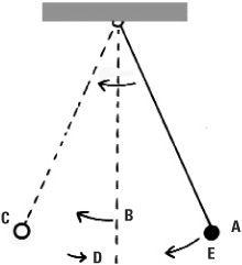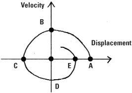 The movement of the bob can be plotted in a phase diagram. On the horizontal axis the (angular) displacement is measured and on the vertical axis the velocity is measured. The point of release is plotted at the point A on the positive horizontal axis. At A the displacement is at a maximum and the velocity is zero. As the bob moves through the vertical axis (where the displacement is zero) the velocity is at a maximum, and this is plotted on the phase diagram at B. At C when the bob is at the other extremity of its swing, the displacement is negative and the velocity is zero. The bob then swings back through D (where it is moving in the opposite direction so its velocity is negative) and completes one swing at E. In the phase diagram this is represented by a rotation through 360 degrees, but because the swing is reduced the point E is shown inside A. As the pendulum swings less and less this phase portrait spirals into the origin until eventually the pendulum comes to rest.