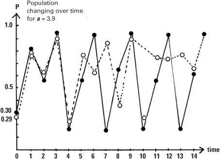 If we now choose a = 3.9, a value near the maximum permissible, and use the same initial population p = 0.3 the population does not settle down but oscillates wildly. This is because the value of a is in the ‘chaotic region’, that is, a is a number greater than 3.57. Moreover, if we choose a different initial population, p = 0.29, a value close to 0.3, the population growth shadows the previous growth pattern for the first few steps but then starts to diverge from it completely. This is the behaviour experienced by Edward Lorenz in 1961 (see box).
