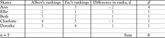 Occasionally we have only the ranks as data. Let’s look at Albert and Zac, two strong-minded ice skating judges at a competition who have to evaluate skaters on artistic merit. It will be a subjective evaluation. Albert and Zac have both won Olympic medals and are called on to judge the final group which has been narrowed down to five competitors: Ann, Beth, Charlotte, Dorothy and Ellie. If Albert and Zac ranked them in exactly the same way, that would be fine but life is not like that. On the other hand we would not expect Albert to rank them in one way and Zac to rank them in the very reverse order. The reality is that the rankings would be in between these two extremes. Albert ranked them 1 to 5 with Ann (the best) followed by Ellie, Beth, Charlotte and finally Dorothy in 5th position. Zac rated Ellie the best, followed by Beth, Ann, Dorothy and Charlotte. These rankings can be summarized in a table.