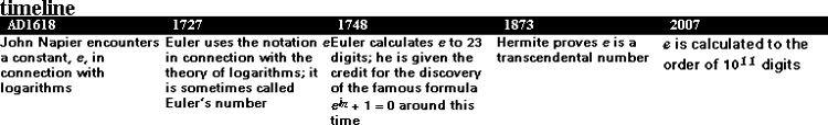 e is the number whose approximate value is 2.71828. So why is that so special? It isn’t a number picked out at random, but is one of the great mathematical constants. It came to light in the early 17th century when several mathematicians put their energies into clarifying the idea of a logarithm, the brilliant invention that allowed the multiplication of large numbers to be converted into addition.