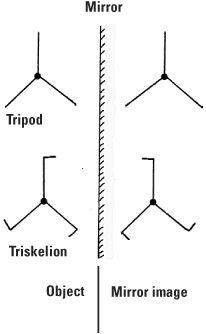 Can we set up a mirror so that an object looks the same in front of the mirror as in the mirror? The word MUM has mirror symmetry, but HAM does not; MUM in front of the mirror is the same as MUM in the mirror while HAM becomes MAH. A tripod has mirror symmetry, but the triskelion (tripod with feet) does not. The triskelion as the object before the mirror is right-handed but its mirror image in what is called the image plane is left-handed.