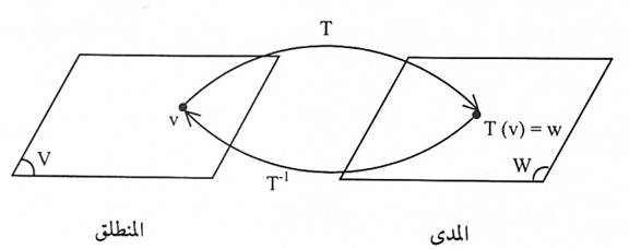 فإذا كانت T:V⟶W تحويلة خطية فإن مدى T هو فضاء جزئي من W يتكون من جميع صور المتجهات في V تحت تأثير T. إذا كانت T متباينة فإن كل متجه v في V يمتلك صورة وحيدة w = T(v) في مدى T. وحدانية الصورة هذه تساعدنا في تعريف معكوس T، يكتب T-1، التي تعيد الصور w إلى v، لاحظ الشكل (8-4).