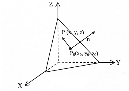 نفرض أننا نريد إيجاد معادلة المستوى المار بالنقطة P0 (x0 , y0 , z0) وله المتجه غير الصفري n = (a, b, c) العمود عليه.