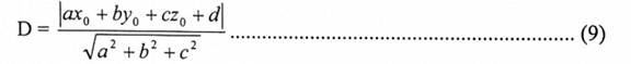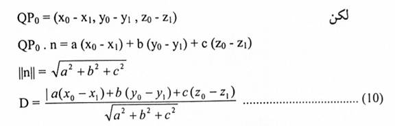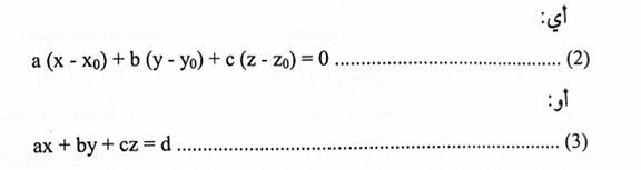 لتكن P (x0, y0, z0) نقطة معلومة ax + by + cz + d = 0 المستوى المعلوم فإن المسافة D بين النقطة والمستوى.