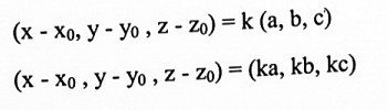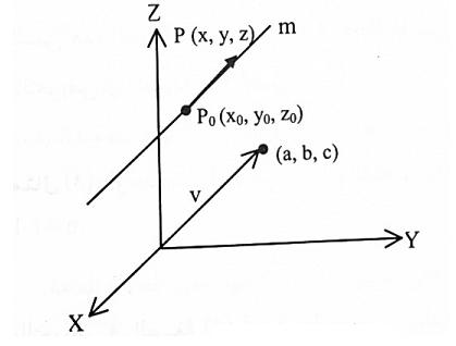 الطريقة الأولى: ليكن m مستقيم ما يمر بالنقطة P0 (x0, y0, z0) وموازياً للمتجه v = (a, b, c)