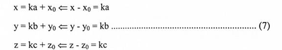 الطريقة الثانية: ليكن r (x, y, z) متجه ما منة نقطة الأصل للنقطة P (x, y, z) و r0 (x0, y0, z0) متجه من نقطة الأصل للنقطة P0 (x0, y0, z0) و v = (a, b, c) متجه موازي للمستقيم m، كما في الشكل (3-33).