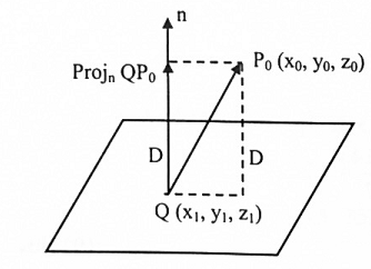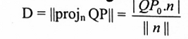 نفرض Q (x1, y1,z1 نقطة واقعة في المستوى. نرسم المتجه n = (a, b, c) عمودياً على المستوى في النقطة Q (الشكل 1-4). المسافة D تساوي طول المسقط العمودي للمتجه QP0 على n. بوساطة الصيغة (9) في (الضرب النقطي ,المساقط):