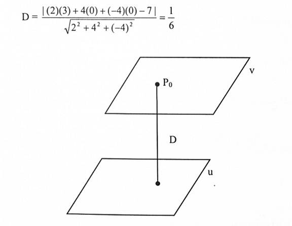 لإيجاد المسافة بين المستويين نختار نقطة معينة في إحداهما ونوجد المسافة بين النقطة والمستوى الآخر، بفرض y = z = 0 في المعادلة x + 2y – 2z = 3 نحصل على P0 (3,0,0) في هذا المستوى. وبوساطة الصيغة (9) فإن المسافة D من P0 إلى المستوى 2x + 4y – 4z = 7