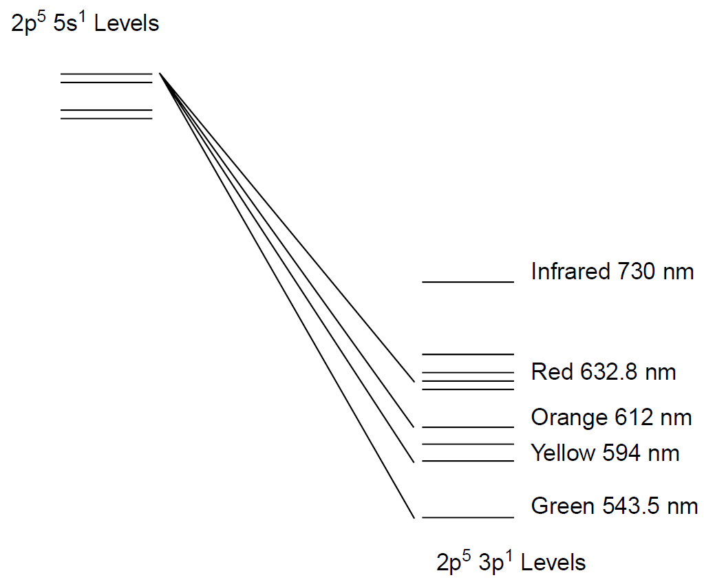 As one might imagine, the two levels involved are not singular levels but rather a group of closely spaced energy levels. The upper level (2p5 5s1) is actually four hyperfine levels, and the lower level (2p5 3p1), 10 separate levels! Unlike sodium or hydrogen, there is more than one electron in the outer shell; in the case of neon, a total of eight electrons exist in the outer (n = 2) shells. These electrons interact to produce many possible energy levels. As a result, there are numerous transitions at which the helium–neon laser can operate. Some transitions are favored