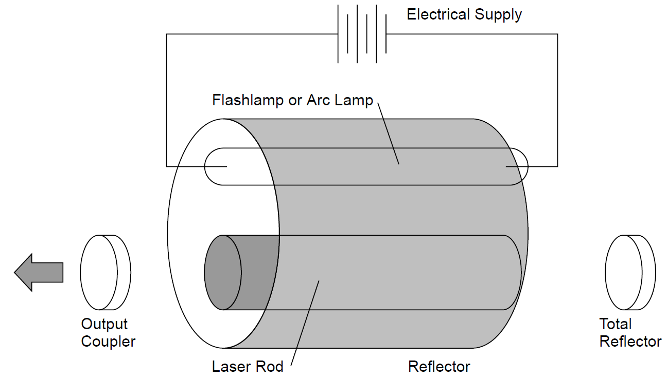Pumping is the process of supplying energy to the laser medium to excite the upper energy levels. It may be accomplished by any number of means, including electrical, thermal, optical, chemical, or nuclear. Most common lasers utilize electrical pumping (as seen in the previous example with the helium–neon laser) or optical pumping, as shown in Figure 1.1. In the case of optical pumping, light from a flash lamp or an arc lamp is focused onto a rod containing the lasing atoms. Common laser rods include ruby (chromium ions in an aluminum oxide host glass) and YAG (neodymium ions in a yttrium aluminum garnet host glass). The lasing atoms (chromium or neodymium in this case) absorb photons of incident pump light and