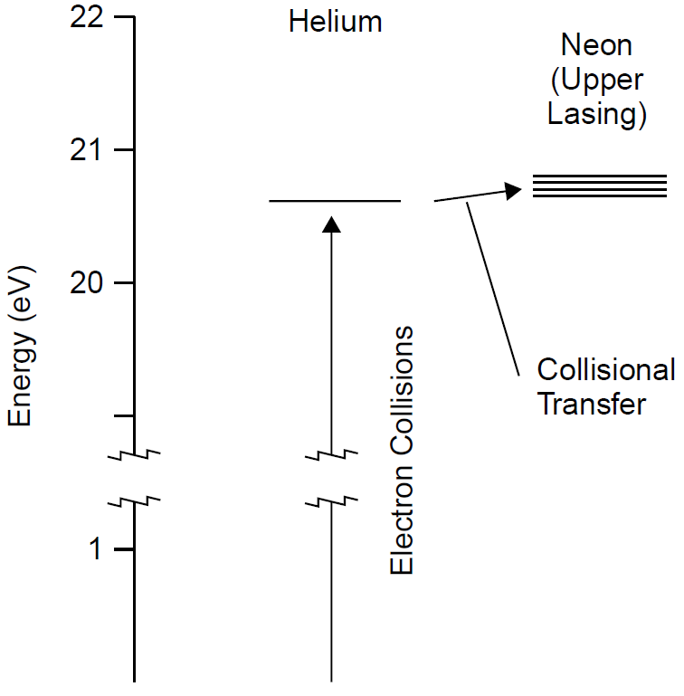 become excited to upper energy levels. An electrically pumped laser (like most gas lasers) uses an electrical discharge to excite atoms directly to high energy levels. In some lasers (e.g., the He Ne), the actual lasing atom is neon, which is pumped with energy via a multistep process involving the transfer of energy between two atomic species. In this case, helium serves to pump the neon atoms when a helium atom (excited by the electrical discharge) collides with a neon atom, transferring energy to the neon atom.