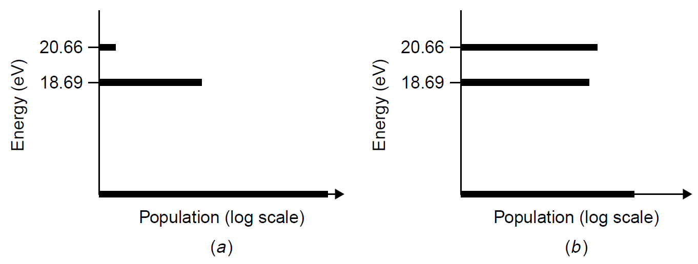 Figure 1.3. Population energies of neon atoms (a) at equilibrium and (b) in a He Ne laser.