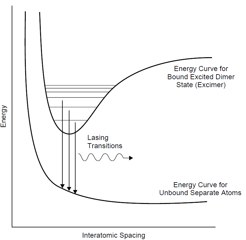energy state is formed when the inert atom and the halogen form an excited dimer (or excimer) molecule. This is a temporary state that forms only for an instant in time when the excited atoms combine to form a molecule. The energy of the excimer molecule is much higher than that of the unbound individual atoms and also depends on the interatomic spacing in a similar manner to that of any other molecule, such as hydrogen. As with the hydrogen molecule example, numerous vibrational levels are possible. Collectively, these closely spaced levels form a band serving as the upper lasing level.