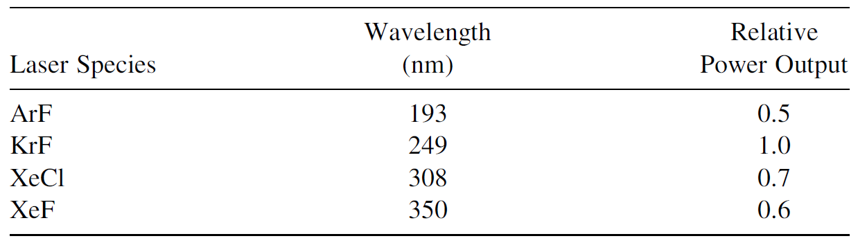 Various excimer species are outlined in Table 1.1, which also lists the relative power output relative to KrF, the lost powerful excimer laser. Although KrF produces the most powerful output, other gas mixtures, such as XeCl, are popular for use in excimer lasers. Shortcomings of the KrF laser include the output wavelength of 249 nm, which is absorbed readily by air, and the extremely corrosive nature of fluorine, which shortens the useful life of the gas mix in this laser. Worse yet from a beam-management perspective is ArF, which produces a wavelength so short that it produces ozone gas from atmospheric oxygen as it passes through air. When using ArF, beam paths must be enclosed and flushed with dry nitrogen, helium, or argon. XeCl, on the other hand, has a longer wavelength, allowing better transmission in air and the use of considerably cheaper optics. The gas mixture also has a much longer useful lifetime (up to 10 times longer, by some estimates). The useful lifetime of lasing gases may also be extended by using a cryogenic gas processor in which the lasing gas mixture is passed through coils immersed in liquid nitrogen to trap impurities (some of which adsorb from internal components and others produced by the hostile environment inside the laser) in the gas mixture. A cryogenic gas processor such as that shown in Figure 1.2 is a standard option on most commercial excimer lasers. In the figure two copper lines, evident on the top of the processor, connect to the laser vessel itself, and laser gas is recirculated continually by a pump in the processor