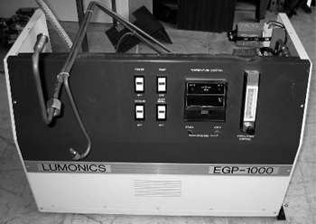 through these lines and into the processor’s cold trap. Many large excimer lasers (i.e., intended for prolonged use) have gas ports allowing connection of a gas processor. The cost of a gas fill is quite pricey, so gas processors pay back quickly for many industrial users.