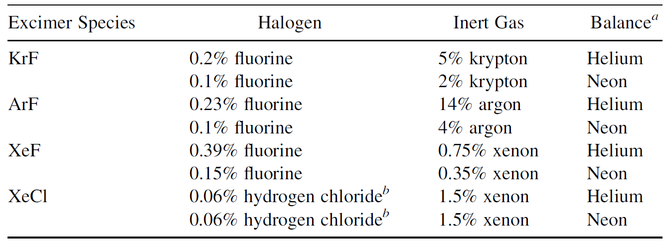 excimer gas mixtures for two different excimer lasers, as specified by a manufacturer of such lasers. In all cases, only a tiny amount of halogen (fluorine or HCl) is used in the gas mixture, along with a moderate amount of inert gas, with the vast majority of the mixture an inert buffer gas such as helium or neon. Aside from assisting in excitation of the molecule and helping to distribute the discharge, helium also helps to conduct heat away from the discharge so that the gas mixture can be cooled by a heat exchanger inside the laser housing.