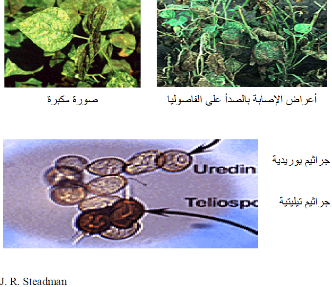 شكل رقم (1): الأعراض على نبات الفاصوليا وجراثيم الفطر