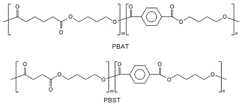 The aliphatic-aromatic polyesters have petrochemical origin, and are generally produced through traditional polycondensation reactions. The structure of two of them, PBAT and PBST. They consist of aliphatic chain segments (residues of 1,4-butanediol, and of adipic or succinic acid), which provide flexibility, toughness, and biodegradability and aromatic segments (residues of terephthalic acid and 1,4-butanediol) , which impart mechanical strength and rigidity.