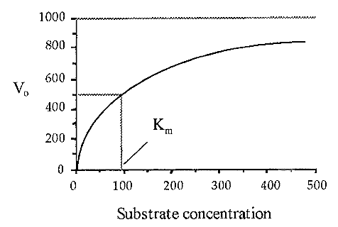 Note: The substrate dilution curve must not be confused with the similarly-shaped progress curve. The Km, i.e. that substrate concentration which gives one half of the maximal velocity possible (at that enzyme concentration) is a constant. characteristic for a particular enzyme acting on a particular substrate. Knowledge of the Km is useful when devising an enzyme assay as it enables one to use a substrate concentration where Vo will not be too sensitive to small changes in [S] due to experimental error. A good rule-of-thumb is that [S] should be as high as possible, preferably at a level where the substrate dilution curve is asymptotic to Vmax. Often, however, [S] is constrained by cost or experimental practicability, and values of less than Km may have to be used. For example the proteinase cathepsin B is routinely assayed at [S] = 1/4 Km, using a fluorogenic substrate.