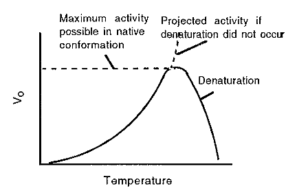 Finally, temperature also influences Vo. Two effects interact to give a resultant curve. On the one hand, like all chemical reactions, the velocity of enzyme-catalyzed reactions increases with an increase in temperature, typically doubling for every 10C rise in temperature. In the case of an enzyme-catalyzed reaction, however, eventually a temperature is reached where the enzyme becomes unstable and begins to denature, at which point the reaction rate again declines. The resultant is usually an asymmetrical peak, which rises relatively slowly with an increase in temperature, and then drops rather suddenly (Fig. 6).
