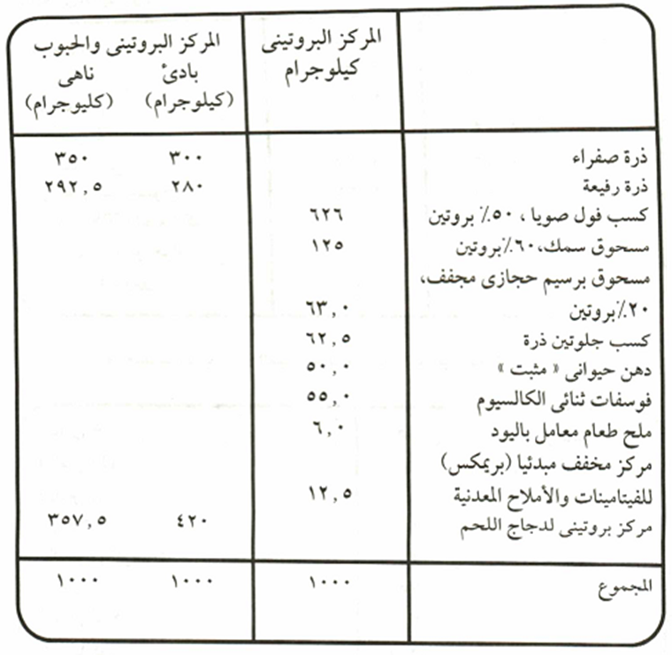 تركيب العلائق لدجاج اللحم باستعمال مركز بروتيني وحبوب