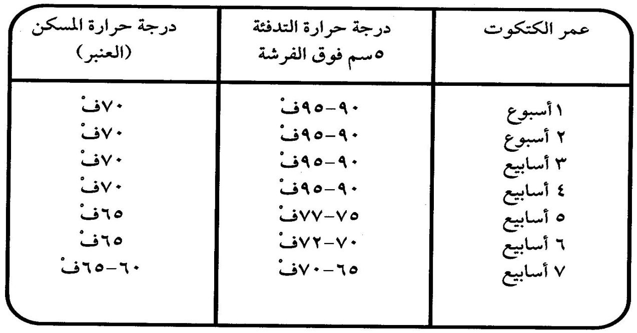 تأخذ قراءة درجة الحرارة اسفل المدفأة وتنظم بالنسبة للطقس الخارجي . يجب أن تكون درجة الحرارة 95فْ عند مستوى الكتكوت في اليومين الأولين، ويراعى أن