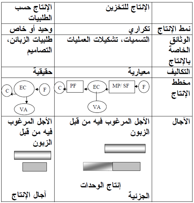3-المقارنة بين نظام الإنتاج وفق التخزين ونظام الإنتاج حسب الطلبيات: إن المؤسسة الصناعية بقدر ما تسعى إلى إنتاج إلا ما يباع وبالتالي تخفيض المخزون، بقدر ما تسعى أيضا إلى الاستجابة السريعة للطلبيات المفاجئة. وبالتالي لكل أسلوب مزايا ونقائص. والجدول التالي يبين المقارنة بين النظامين في عدة خصائص.