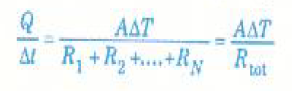حيث TΔ الفرق بين درجتي حرارة سطحي الحائط. لاحظ أن عدد الحدود في مقام الطرف الأيمن يساوي عدد الطبقات في الحائط. وتعتبر الكميات R1/k1 وأمثالها مقاييس لمقاومة مختلف الطبقات لانسياب الحرارة خلال الطبقة، ويعرف كل منها بالقيمة R للطبقة المعنية. فإذا كان الحائط مكوناً من N طبقة، يمكن كتابة المعادلة السابقة بدلالة القيم R على الصورة: