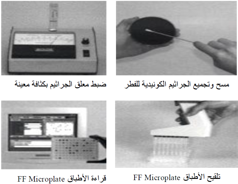 3- يضاف معلق الجراثيم بمعدل ul 100 في كل حفرة الموجود في طبق FF Microplate