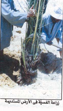 * ويراعى وضع الفسيلة في الجورة ويكتفى بموارة منطقة الجذور في التربة مضافاً إليها 5- 10سم ، ويجب ألا يتعدى الردم أكبر قطر في قاعدة الفسيلة مع ملاحظة أن يكون القلب بعيداً عن الشمس وقت الظهيرة وبعيداً عن مستوى سطح التربة ، ويردم حول الفسيلة جيداً بكبس التربة حولها ثم يجرى الري لتثبيت التربة ويزداد الردم في الجور التي تهبط تربتها بعد الري مع مراعاة تغطية الفسائل بعد الغرس بخيش أو قش أرز أو أكياس لحمايتها من حرارة الصيف أو برودة الشتاء .