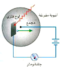 الشكل 1)): عندما يرتطم باللوح الفلزي، فإن الإلكترونات تتبعث منه.