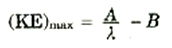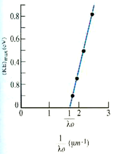 وتتبدى لنا نتيجة مهمة عندما نقيس V0 المناظرة لأطوال موجية ساقطة مختلفة فعندما نرسم العلاقة بين (KE)max مع 1/λ ، تكون النتيجة خطأ مستقيماً، كما هو موضح بالشكل (3). أضف إلى ذلك، أن قيمة λ التي تصبح عندها (KE)max صفراً هي الطول الموجي المشرفي 0λ. وتصبح معادلة الخط المستقيم = mx + vλ، في هذه الحالة: