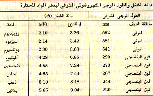حيث يمثل هذا الحد الأدنى للشغل بالرمز ϕ ويسمى دالة الشغل لمادة معينة وقد أوردنا في الجدول ((1 قيماً لدالة الشغل لقليل من الفلزات. ويلاحظ أن الضوء فوق البنفسجي هو الذي يلزم في العديد من الحالات لانتزاع الإلكترونات من الفلزات.