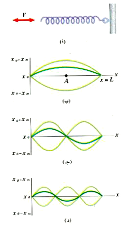 الشكل 1)): الموجات المستقرة الناتجة عن الاهتزاز الطولي لزنبرك. هذه المنحنيات تصف المسافات بين كل حلقتين متجاورتين ، ولكنها لا تمثل الشكل الحقيقي للزنبرك.
