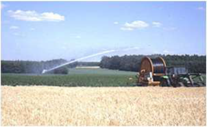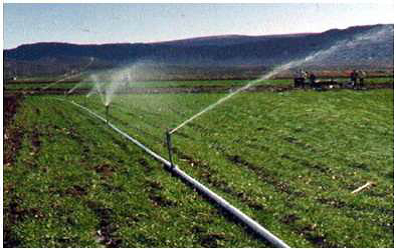 2- الرش النقال: وله أنواع كثير مثل الخط المنقول يدويا ، خط الري المسحوب من نهايته، وخط الري المنقول جانبيا وفي هذه النظم يتم شراء الخطوط والرشاشات التي تكفي ري جزء من الحقل فقط ثم يتم نقل النظام عند انتهاء الري إلى جزء آخر من الحقل ثم ريه وبعد ذلك ينقل النظام وهكذا وتتميز هذه النظم بانها أقل تكلفة من النظام الثابت إلا أنها تحتج إلى عمالة أكثر.
