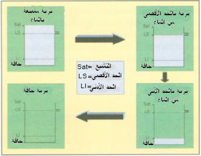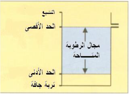 * الحد الأدنى: يصل مستوى الماء أدناه في حالة عدم التزود بالماء مع استمرار التبخر القائم وامتصاص الجذور للماء الموجود في التربة، بحيث آنذاك لا تجد الجذور ماء قادرة على امتصاصه وإن كانت هناك بعض البقايا جد ملتصقة بالتربة ويسمى هذا الحد أيضا نقطة الذبول الدائم.